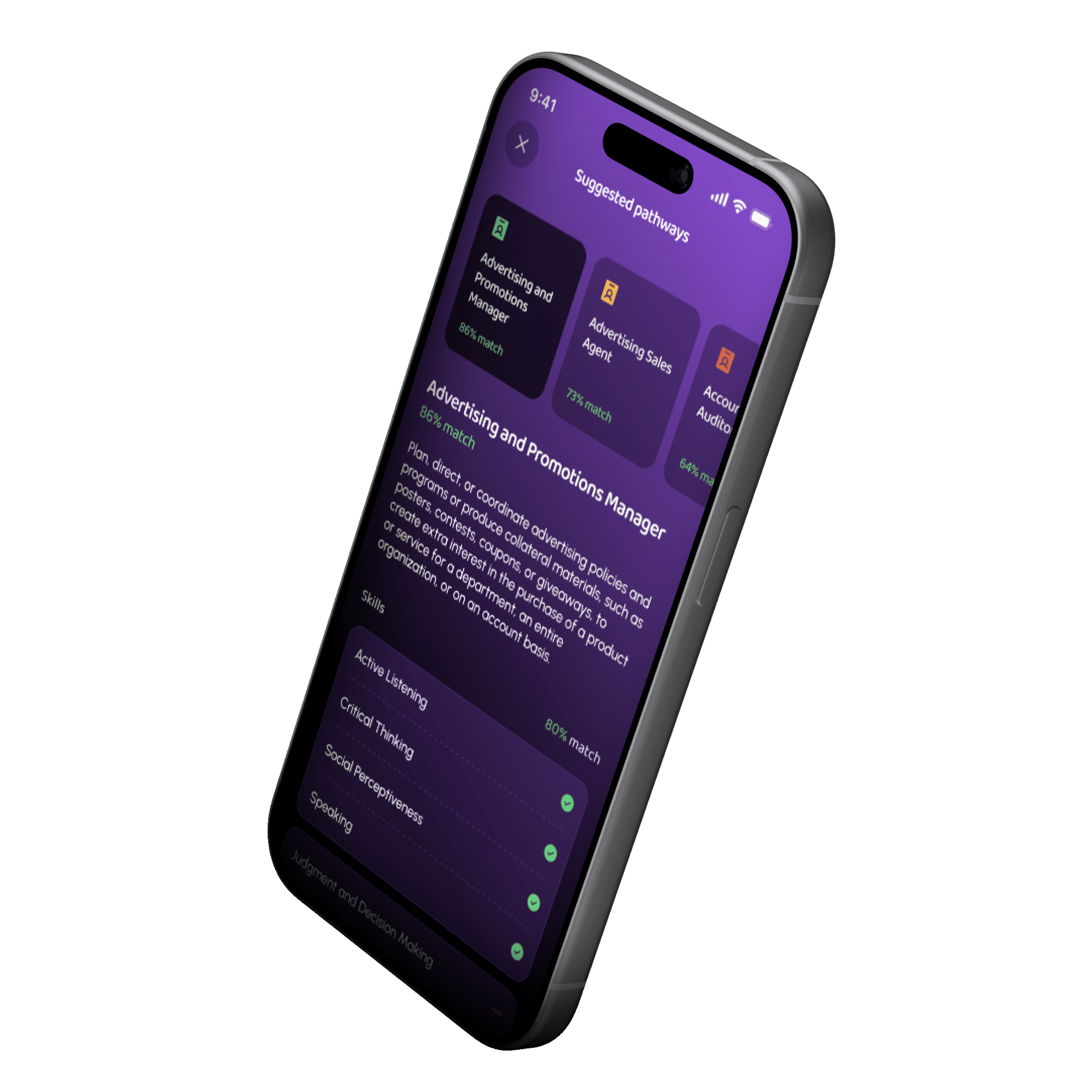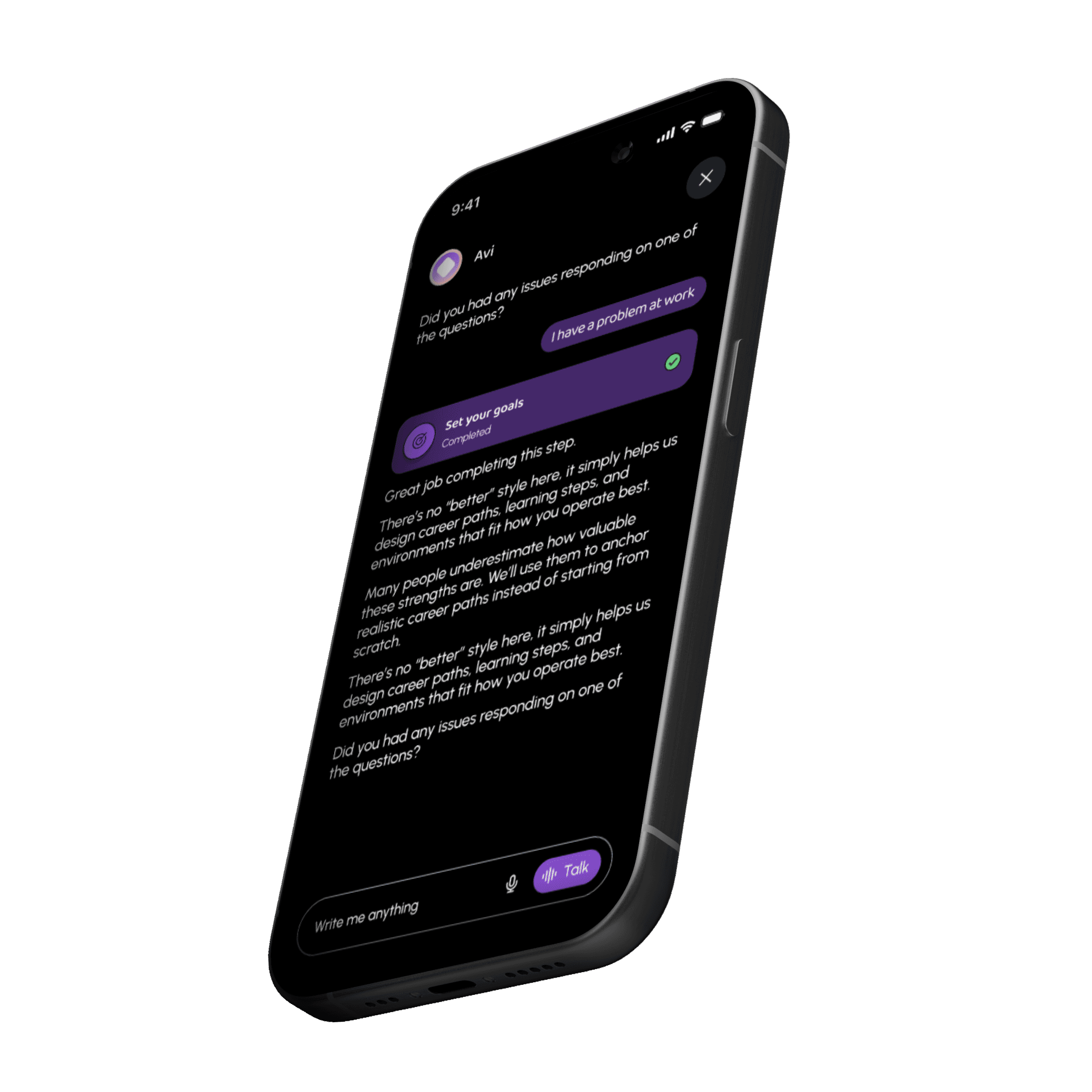 Avi guides you step by step, helping you understand your strengths and what skills you need next.